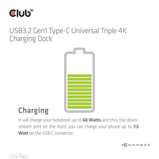 Laptops / UltraBooks / Tablets often have limited connectivity possibilities. By adopting PD Charging technology and upstream-charging function through USB Type C interface the Club3D USB Type C Charging Dock offers unique functionality. It will charge your Notebook up to 60Watts and thru the downstream port on the front you can charge your phone up to 7.5 Watt on the USB C connector.