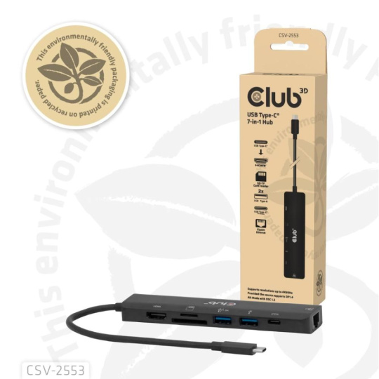 Club 3D CSV-2553 je USB-C, rozbočovač 7 v 1 s HDMI, 2x USB, RJ45, sloty pro karty microSD/SD a portem USB-C samice, který představuje ideální řešení pro rozšíření portu USB-C nebo Thunderbolt 3 (PC/Laptop/tablet/mobilní telefon atd.) speciálně pro hostitele s jediným portem USB-C.