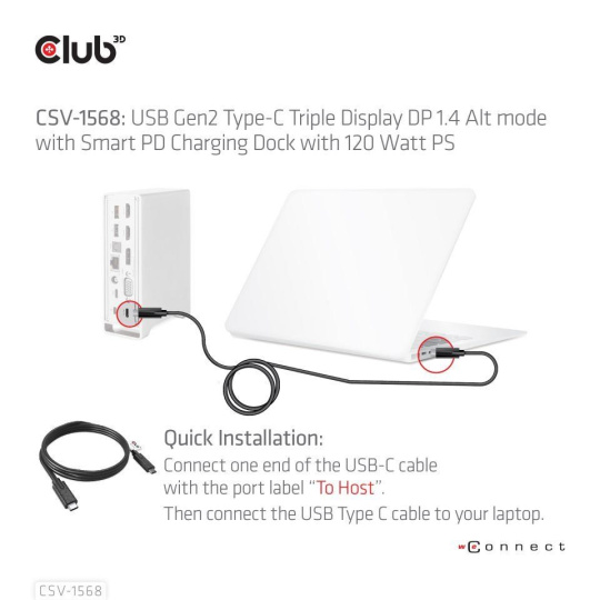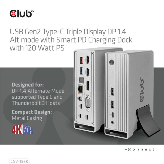The Club 3D CSV-1568 USB Gen2 Type-C Triple Display DP™ Alt mode + Smart PD Charging Dock with 120 Watt PSU, is an integrated solution combining Video, Data, Power, Ethernet and Audio. It has 4 videos (output 3 videos simultaneously under MST mode) for video transmission, 4 USB data ports (2 USB-A 10G, 1 Type-C 10G, 1 USB-A 5G)for data transmission, 1 USB-A smart charging port for quick charging, 1 Gigabit Ethernet for super fast Ethernet, 2 audio ports (3.5mm audio, Toslink) for enjoying music. Besides, this dock is equipped with dual power jack (Type-C PD Charging or 120W DC power supply).