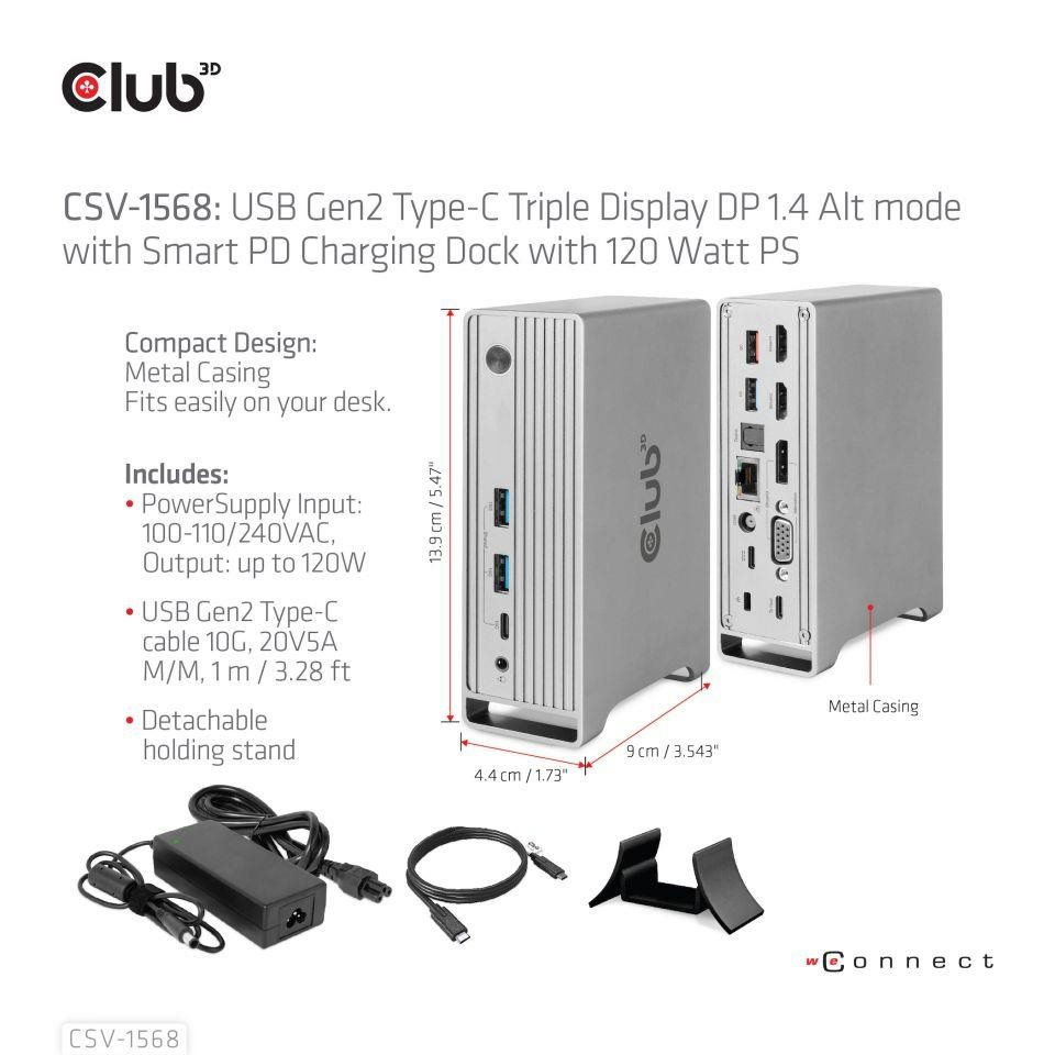 The Club 3D CSV-1568 USB Gen2 Type-C Triple Display DP™ Alt mode + Smart PD Charging Dock with 120 Watt PSU, is an integrated solution combining Video, Data, Power, Ethernet and Audio. It has 4 videos (output 3 videos simultaneously under MST mode) for video transmission, 4 USB data ports (2 USB-A 10G, 1 Type-C 10G, 1 USB-A 5G)for data transmission, 1 USB-A smart charging port for quick charging, 1 Gigabit Ethernet for super fast Ethernet, 2 audio ports (3.5mm audio, Toslink) for enjoying music. Besides, this dock is equipped with dual power jack (Type-C PD Charging or 120W DC power supply).
