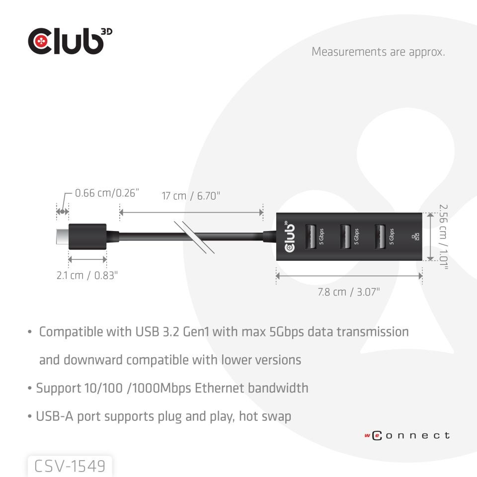 Club 3D CSV-1549 je dokovací stanice USB-C 3.2 se 3 porty USB-A s gigabitovým Ethernetem a je navržen stylovým způsobem + je velmi tenký, takže se snadno přenáší. CSV-1549 vám umožňuje současný přístup k 3 portům USB 3.2 a portu Ethernet 10/100/1000 z jediného up-linku USB-C 3.2. Zařízení je zpětně kompatibilní se standardem USB 2.0, ale to bude mít vliv na výkon. Všechny 3 porty USB jsou kompatibilní s přenosem dat max. 5 Gb/s. Ethernetový port je kompatibilní s Gigabit Ethernet 10/100/1000 (RJ45) a plně duplexní s řízením toku.