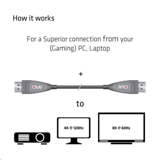 The Club 3D CAC-1079 is an Active Optical Unidirectional DisplayPort™ Cable that allows support for 8.1Gbps per channel. It supports 4K at 120Hz resolution as well as 8K at 60Hz and HDR formats. This optical fiber cable can be applied to outdoor displays, LED signboards, home cinema displays, conference rooms, medical imaging equipment or security systems to transfer audio and video signals.