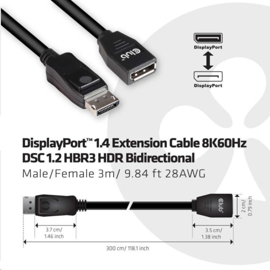 | Club 3D DisplayPort™ 1.4 Extension Cable 8K60Hz DSC 1.2 HBR3 HDR Bidirectional Male/Female 3m/ 9.84ft 28AWG |
