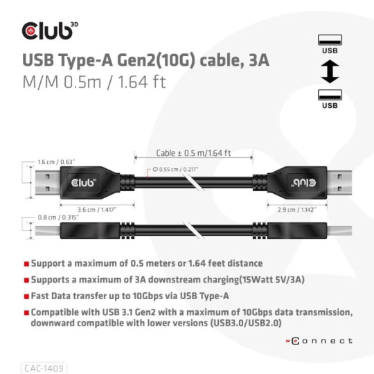 Kabel Club 3D CAC-1409 USB Typ-A Gen2(10G), 3A M/M je kabel USB Typ-A o délce 0,5 m. Je kompatibilní s USB 3.1 Gen 2 s maximální rychlostí 10 Gb/s přenos dat a podporuje až 15W následného nabíjení. Je zpětně kompatibilní s nižšími verzemi, uvědomte si prosím, že specifikace budou omezeny na připojené zařízení.