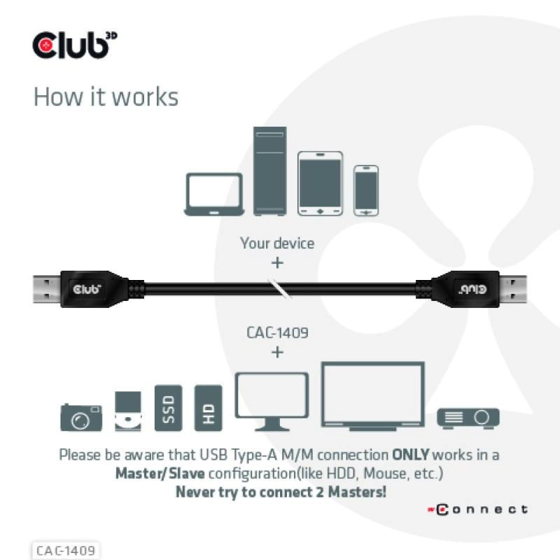 Kabel Club 3D CAC-1409 USB Typ-A Gen2(10G), 3A M/M je kabel USB Typ-A o délce 0,5 m. Je kompatibilní s USB 3.1 Gen 2 s maximální rychlostí 10 Gb/s přenos dat a podporuje až 15W následného nabíjení. Je zpětně kompatibilní s nižšími verzemi, uvědomte si prosím, že specifikace budou omezeny na připojené zařízení.