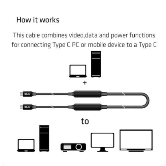 This cable combines video,data and power functions for connecting USB Type C PC or mobile device to a USB Type C display/VR/HardDrive/