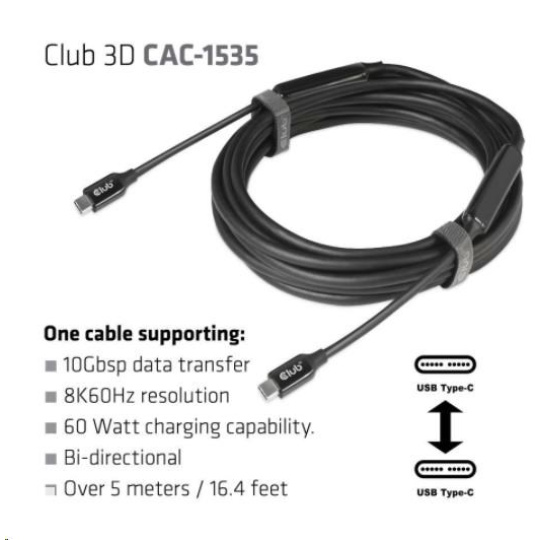 The Club 3D CAC-1535 is an USB Type C to USB Type C Bi-directional Active Cable with a Re-timer chipset for enhancing Video, Data and Power that reaches up to 5 meters / 16.40ft . For video its compatible with DP1.4 standards with a theoretical resolution of up to 8K@60Hz. For data it is compatible with USB3.2 Gen 2 with a maximum of 10Gbps of data transmission and for power it is capable of delivering a max of 60W (20V/3A) PD Charging.