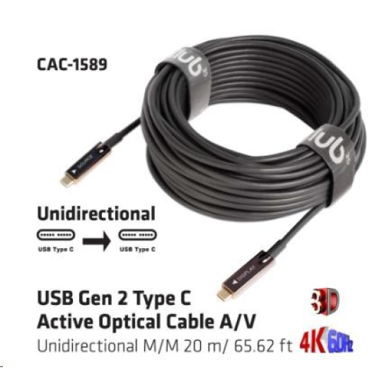 The Club 3D CAC-1589 USB Gen 2 Type C AOC cable enables the connection of your Notebook, Tablet or Phone with USB Type C output to the latest USB C Peripherals and Accessories. It offers Video and Audio over a single 20 m/ 65.62 ft cable.