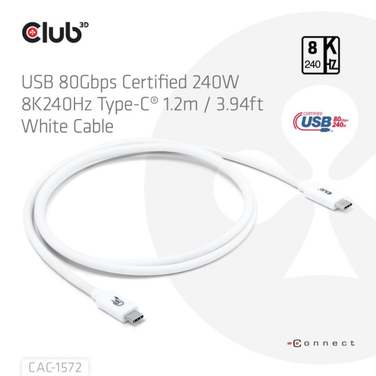 Club3D Kabel USB4 Typ-C, 80Gbps, Certifikovaný kabel, 4K540Hz, 8K240Hz, 16K60Hz, PD 240W, 1.2m, bílá