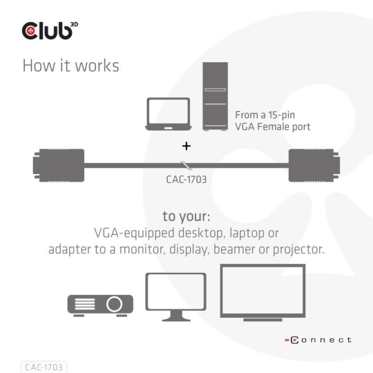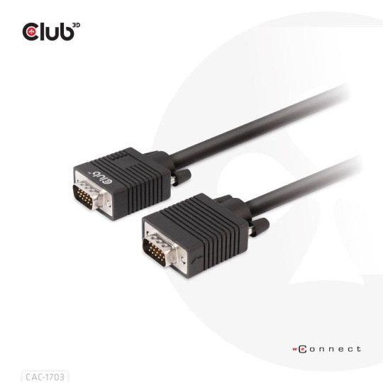 The Club 3D CAC-1703 VGA Cable Bidirectional M/M 3m/9.84ft 28AWG links any VGA-equipped desktop, laptop or adapter to a monitor, display, beamer or projector with a 15-pin VGA Female port. Ideal for at home or work, the cable creates a reliable connection for anything from gaming to video projection and supports up to Full HD 1080p (max. resolution of 1920 x 1080).