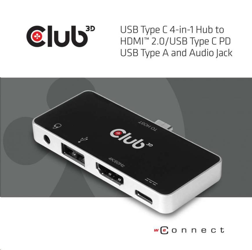 CSV-1591 - The Club 3D Hub is a 4-in-1 USB Type-C hub with HDMI™, USB Type-A 2.0, 3.5mm audio and USB Type-C PD charging, the design perfectly suits all DP Alt-mode capable devices. With this hub, you can enjoy ultra high definition video of your host on big screen, enjoy fantastic music, transmit USB 2.0 data and connect USB Type-C PD Adapter to charge the host.