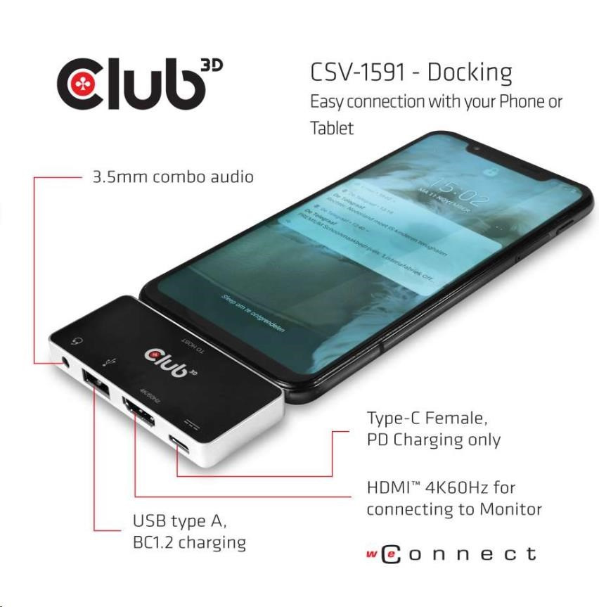 Club3D Dokovací stanice pro mobilní telefony USB-C 4v1, 1xHDMI, 1xUSB-C, 1xUSB, 1x3.5mm, černá