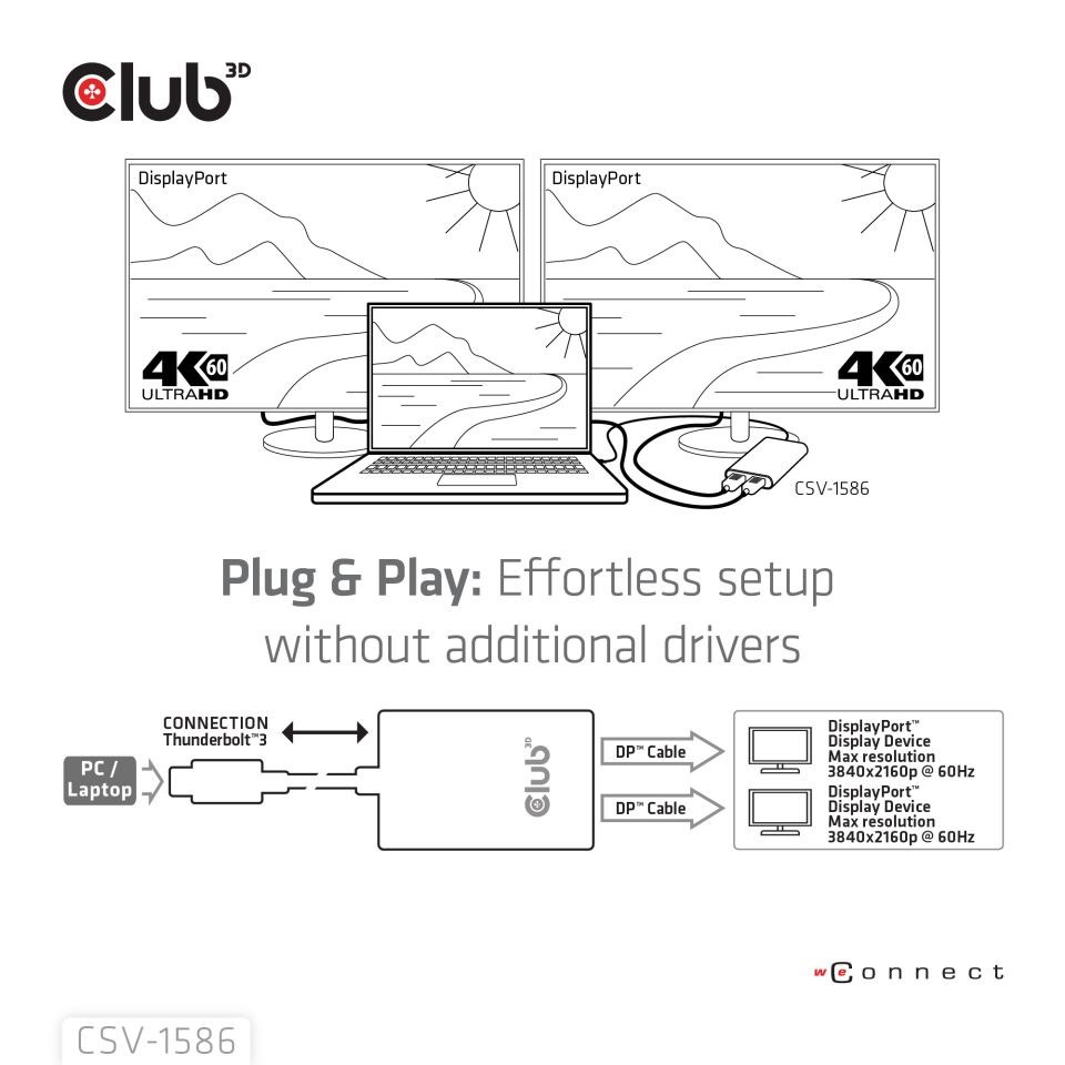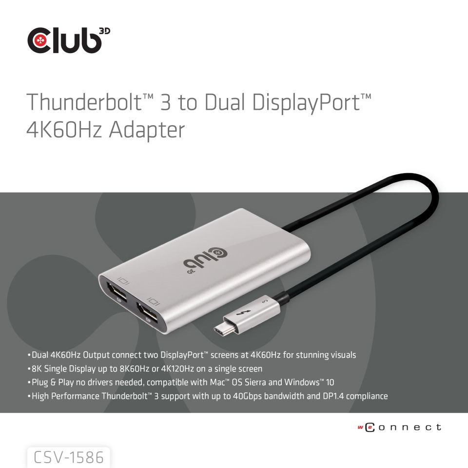 Adaptér Club 3D CSV-1586 Thunderbolt™ 3 na Dual DisplayPort™ 4K60Hz umožňuje uživatelům snadno připojit dvě obrazovky Displayport™ @ 4K60Hz k jakémukoli zařízení s rozhraním Thunderbolt™ 3. Podporované výstupní rozlišení je až duální 4K60Hz nebo 8K60Hz/4K120Hz. jediný displej. Je plně Plug & Play, takže není potřeba instalovat ovladače. Tento stylový adaptér má krásný kryt z broušeného hliníku, díky kterému je pevný a lehký.