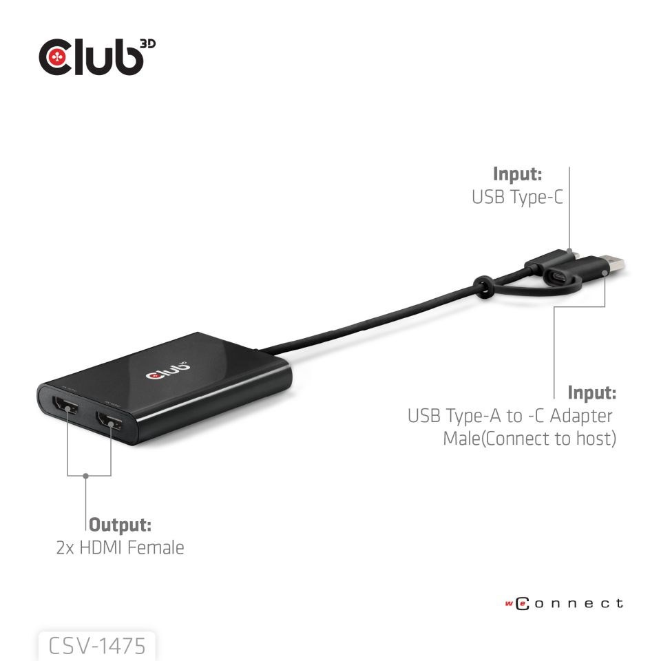 Club 3D CSV-1475 USB-C/A) na duální HDMI (4K60Hz) Video Splitter s DisplayLink® poskytuje nejpokročilejší a nejefektivnější řešení. Podporuje max. jeden 4K60Hz nebo duální 4K60Hz s podporou Extended Desktop.
