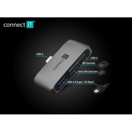 CONNECT IT Dokovací stanice CompactPRO USB-C, 1xUSB-A, 1xUSB-C, MicroSD/SD, šedá