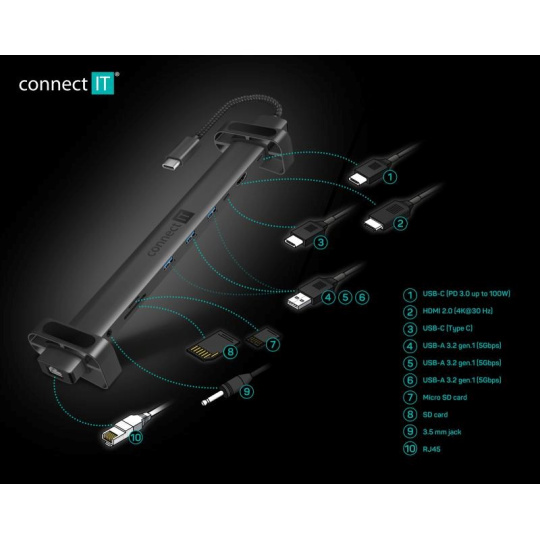 CONNECT IT Dokovací stanice USB-C 10v1, 1xHDMI, 2xUSB-C, 3xUSB, 1xRJ45, černá
