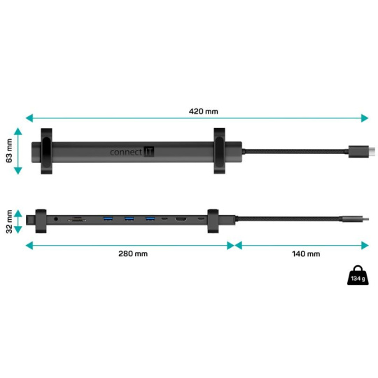 Umožní napájení a připojení dalších periferií jako jsou např. monitor, projektor, televize, myš, klávesnice, MP3 přehrávač, scanner, tiskárna, digitální fotoaparát, externí pevný disk, flashdisk, sluchátka atd. Jedná se o výborný doplněk běžných stolních počítačů i přenosných notebooků, které nemají dostatek vlastních portů. Díky svým kompaktním rozměrům se jedná o ideální příslušenství k notebookům na cesty. Pro připojení k počítači je určeno rozhraní USB-C (Type-C). Hub je možné napájet pomocí USB-C Power Delivery portu. K hubu můžete připojit jakékoli zařízení standardu HDMI, USB-C (Type-C), USB 3.0, 2.0 nebo 1.1 jako jsou myš, klávesnice, MP3 přehrávač, scanner, tiskárna, digitální fotoaparát, externí pevný disk, flashdisk atd.