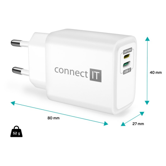 CONNECT IT Duplex nabíjecí adaptér 1xLightning, 1×USB-C, 20W, 1xLightning - USB-C kabel, bílá
