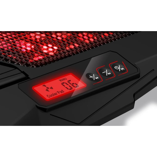 Chladicí podložka pod notebook se čtyřmi šestirychlostními ventilátory, digitálním displejem, výškovým polohováním ve 4 úrovních a dvěma USB porty. Podložka zajišťuje jak odvod tepla z notebooku a jeho ventilačních otvorů, tak i přímé ochlazování pláště notebooku díky cirkulaci chladného vzduchu a celkově tak zvyšuje výkon notebooku. Je plně kompatibilní s notebooky až do velikosti 15,6" a díky kompaktním rozměrům je předurčena jak pro práci doma a v kanceláři, tak i pro cestování a časté přenášení. Ultratichý chod 4 ventilátorů vás nebude rušit ani při nejnáročnější práci vyžadující maximální soustředění. Výšková polohovatelnost ve 4 různých stupních vám zajišťuje maximální pohodlí i při delších pracovních či herních sezeních.