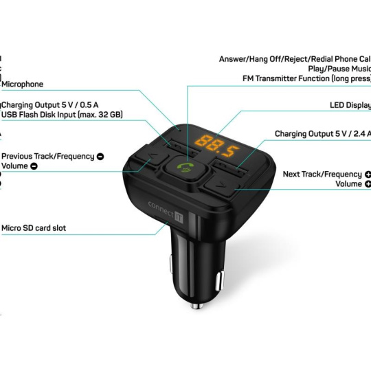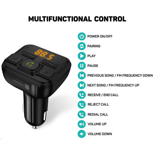 Bluetooth transmitter v kombinaci s dvouportovou nabíječkou je multifunkčí zařízení do vašeho automobilu, díky němuž můžete nejen nabíjet mobilní zařízení, ale také poslouchat hudbu ze svého USB flash disku nebo mobilního telefonu. Transmitter je vybaven digitálním displejem a třemi ovládacími tlačítky pro jednoduché a komfortní ovládání všech funkcí. Navíc je možno připojit i paměťovou Micro SD kartu. Samozřejmostí u tohoto zařízení je i možnost bezdrátového spárování s vašim mobilním telefonem pro uskutečňování telefonních hovorů. Pro tento účel nechybí ani vestavěný mikrofon.