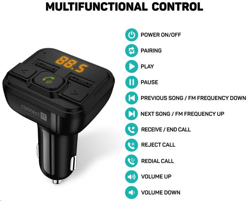 Bluetooth transmitter v kombinaci s dvouportovou nabíječkou je multifunkčí zařízení do vašeho automobilu, díky němuž můžete nejen nabíjet mobilní zařízení, ale také poslouchat hudbu ze svého USB flash disku nebo mobilního telefonu. Transmitter je vybaven digitálním displejem a třemi ovládacími tlačítky pro jednoduché a komfortní ovládání všech funkcí. Navíc je možno připojit i paměťovou Micro SD kartu. Samozřejmostí u tohoto zařízení je i možnost bezdrátového spárování s vašim mobilním telefonem pro uskutečňování telefonních hovorů. Pro tento účel nechybí ani vestavěný mikrofon.
