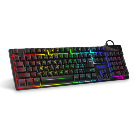 Profesionální gamingová klávesnice NEO series pro hráče počítačových her v českém a slovenském layoutu s celkem 9 módy barevného rainbow podsvícení a čtyřstupňovou regulací intenzity podsvícení. K dispozici je 12 multimediálních kláves.