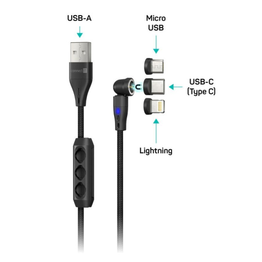CONNECT IT Magnetický kabel PowerLink 3v1, USB-C / Lightning / MicroUSB, 2m, černá