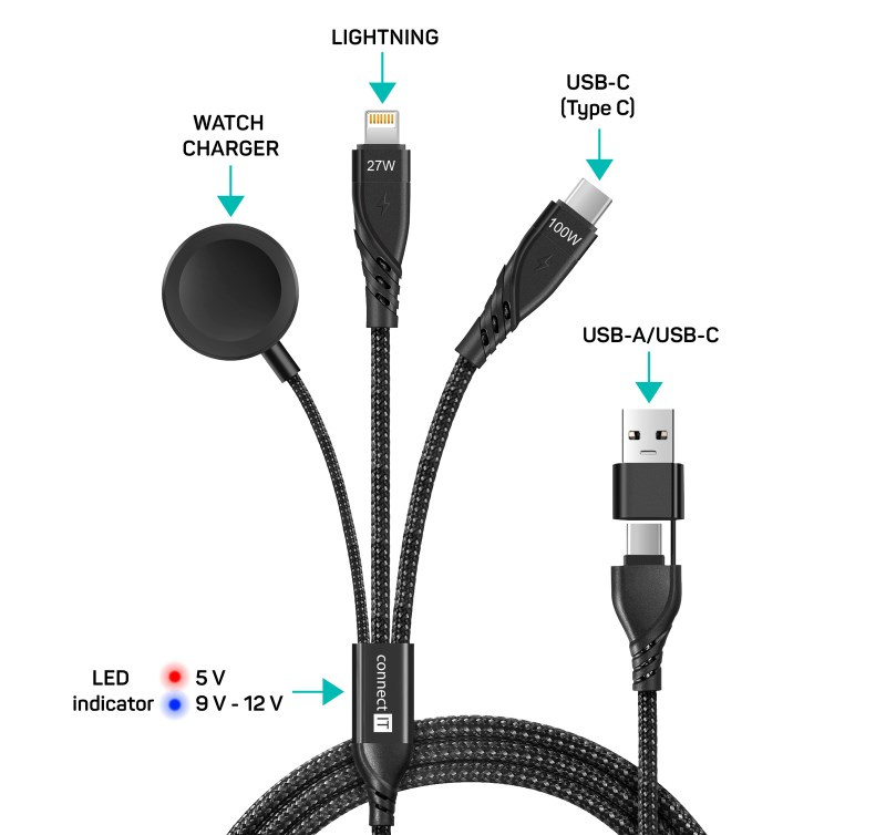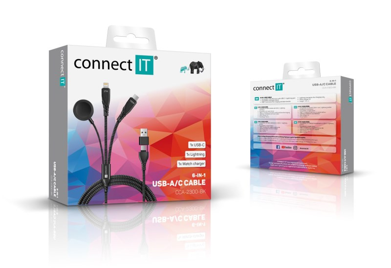Univerzální nabíjecí kabel 6v1 pro nabíjení zařízení s konektory 1x USB-C, 1x Lightning a 1x nabíječka na chytré hodinky (kompatibilní s Apple Watch) se vstupním konektorem USB-C a redukcí na USB-A. Umožňuje nabíjení až tří zařízení současně s podporou rychlého nabíjení pomocí max. proudového toku 5 A. Speciální manžetová nadstavba konektorů zaručuje lepší přístupnost k nabíjecím zdířkám mobilních telefonů v pouzdrech.