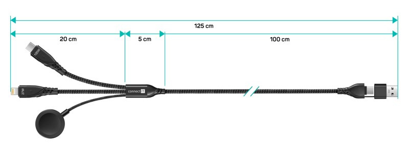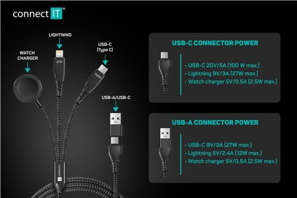 CONNECT IT Nabíjecí kabel Wirez 6v1, USB-C/USB, Lightning, Bezdrátová nabíječka na hodinky, 1.25m, černá