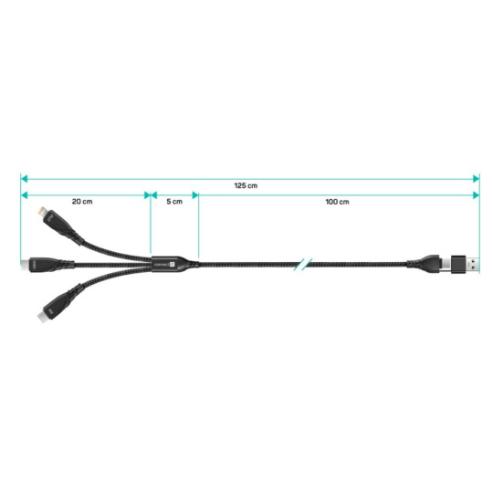 Univerzální nabíjecí kabel 6v1 pro nabíjení zařízení s konektory 2x USB-C,1x Lightning se vstupním konektrom USB-C a redukcí na USB-A. Umožňuje nabíjení až tří zařízení současně s podporou rychlého nabíjení pomocí max. proudového toku 5 A. Speciální manžetová nadstavba konektorů zaručuje lepší přístupnost k nabíjecím zdířkám mobilních telefonů v pouzdrech.