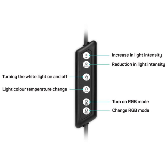 | Dálkové ovládání umožňuje | - změnu intenzity světla v 9 úrovních - nastavení barevné teploty světla - celkové zapnutí a vypnutí světla - zapnutí a vypnutí RGB módu - změnu RGB světelných efektů |
