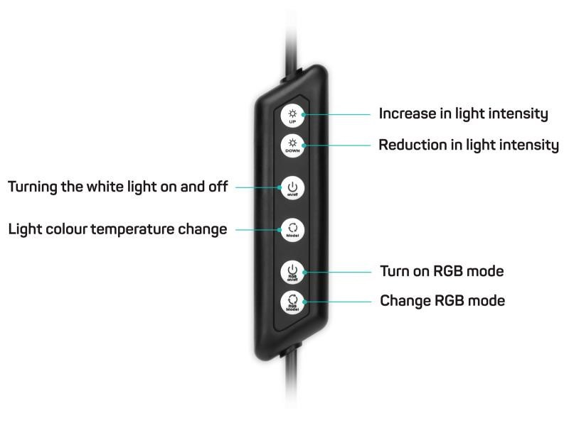 | Dálkové ovládání umožňuje | - změnu intenzity světla v 9 úrovních - nastavení barevné teploty světla - celkové zapnutí a vypnutí světla - zapnutí a vypnutí RGB módu - změnu RGB světelných efektů |