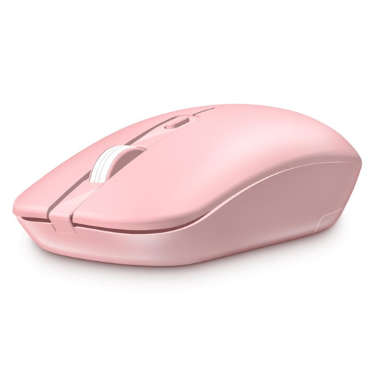Bezdrátová klávesnice a optická myš v elegantním růžovém designu, určena pro domácí i profesionální použití v kancelářích a firmách.
