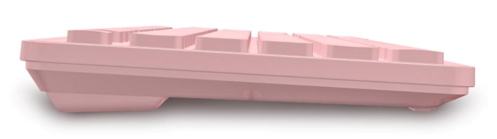 Bezdrátová klávesnice a optická myš v elegantním růžovém designu, určena pro domácí i profesionální použití v kancelářích a firmách.