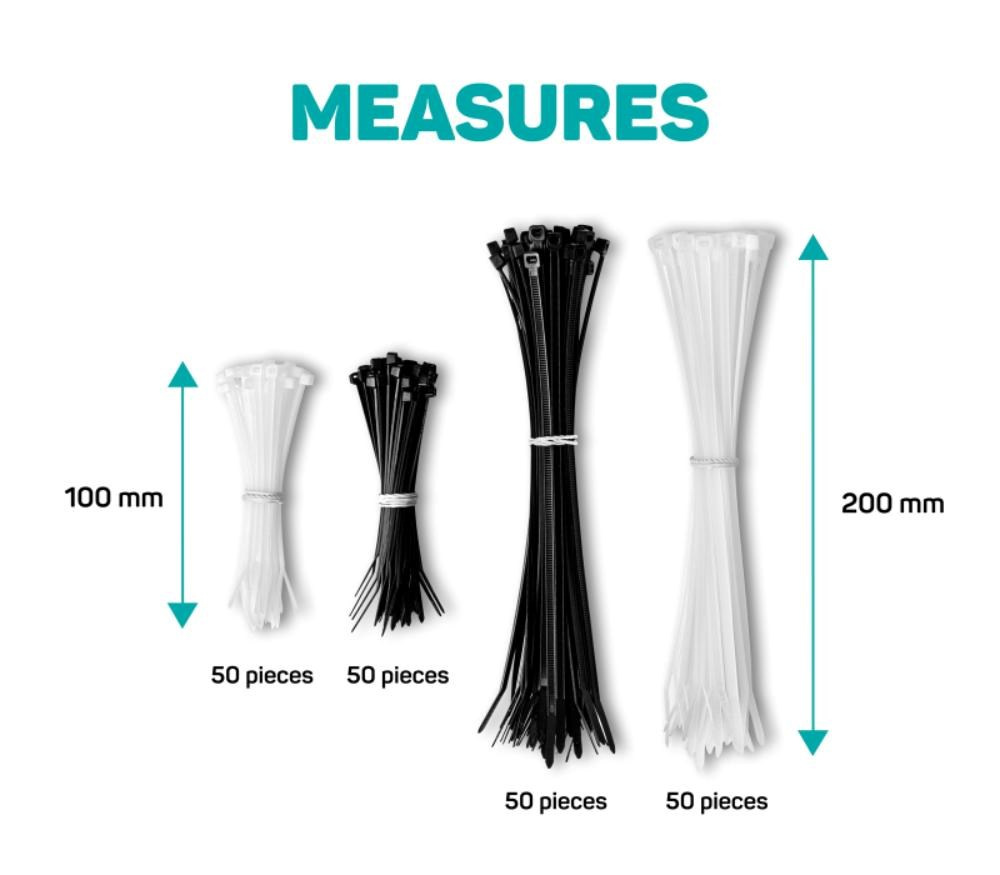 | Velikost a počet | - 50ks (černá) 100mm - 50ks (bílá) 100mm - 50ks (černá) 200mm - 50ks (bílá) 200mm |