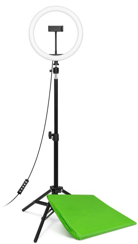 | Obsah balení | Kruhové LED světlo Přívodní kabel s dálkovým ovládáním Flexibilní držák mobilního telefonu Stativ s kulovou hlavou Green screen Návod k obsluze |