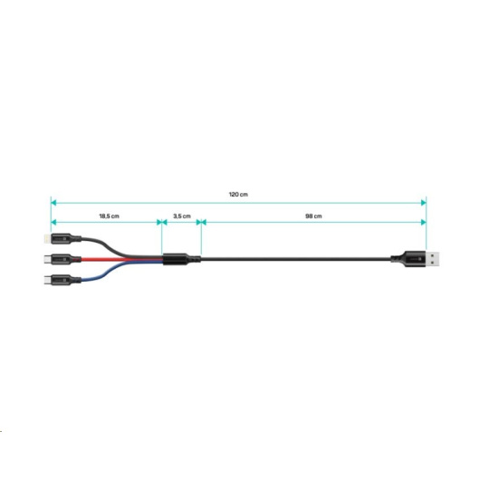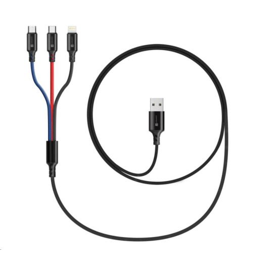 Univerzální nabíjecí kabel 3v1 na nabíjení zařízení s konektory Micro USB, Lightning a USB-C (Type C) umožňuje nabíjení až tří zařízení současně s podporou rychlého nabíjení pomocí max. proudového toku 2 A. Speciální manžetová nadstavba konektorů Micro USB, Lightning i USB-C (Type C) zaručuje lepší přístupnost k nabíjecím zdířkám mobilních telefonů v pouzdrech.