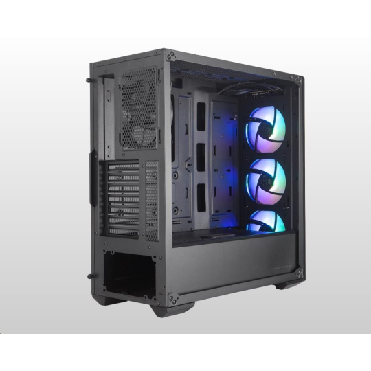 MasterBox MB520 ARGB je optimální herní počítačová skříň formátu ATX, ve které se můžete pochlubit osvětlením komponent a zároveň udržet systémy chladné. Přední panel DarkMirror je o odstín tmavší, aby dodal předinstalovaným ventilátorům ARGB ostřejší kontrast. Na každé straně předního panelu se shora dolů rozprostírá ventilační síťka, která zajišťuje značné proudění vzduchu uvnitř skříně.