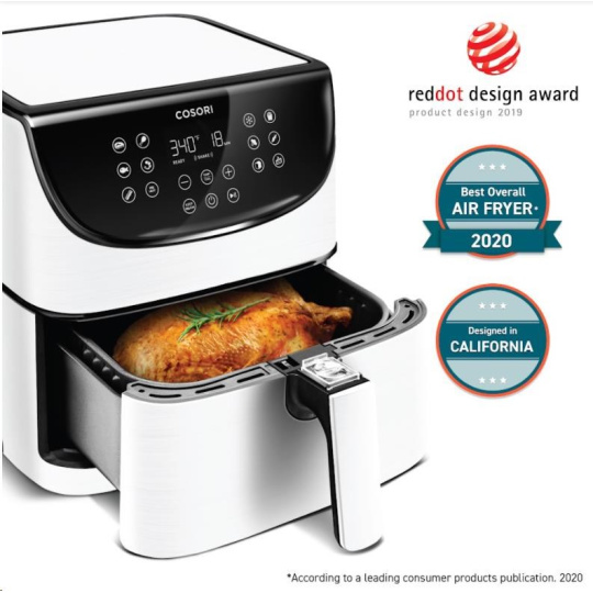Design horkovzdušné fritézy COSORI CP158-AF byl navržen v Kalifornii. Díky své praktičnosti, funkcím, ovládání i přehlednému dotykovému nakloněnému LED displeji se snadno přístupnými tlačítky získal také prestižní ocenění Red Dot Award a Design Award za nejlepší design. Povrchová úprava je navíc odolná vůči otiskům prstů, takže fritéza bude ve vaší kuchyni vypadat pořád skvěle. Podle prodejních statistik je značka COSORI také nejprodávanější značkou horkovzdušných fritéz v USA.