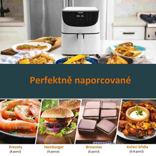 S horkovzdušnou fritézou COSORI CP158-AF PREMIUM si můžete užít vaše oblíbená smažená jídla bez výčitek, protože na rozdíl od běžného smažení nebo fritování je možné v ní připravovat jídla za použití velice malého množství oleje a nebo vůbec žádného. Kombinace cirkulujícího horkého vzduchu, dokonalé teploty vaření a chytrých programů zajistí, že hranolky budou vždy krásně křupavé a kuřecí stehna šťavnatá. Ať už je vaše jídlo čerstvé nebo mražené, stisknutím tlačítka můžete horkým vzduchem smažit kuřecí křídla, kuřecí prsa, sladké brambory, steaky, čerstvé hranolky a mnoho dalšího. Až budete mít hotovo, čištění bude stejně snadné díky nepřilnavému koši, který lze mýt v myčce. Díky veliké nádobě s objemem 5,5l navíc dokážete rychle navařit i pro větší rodinu nebo skupinu hostů.