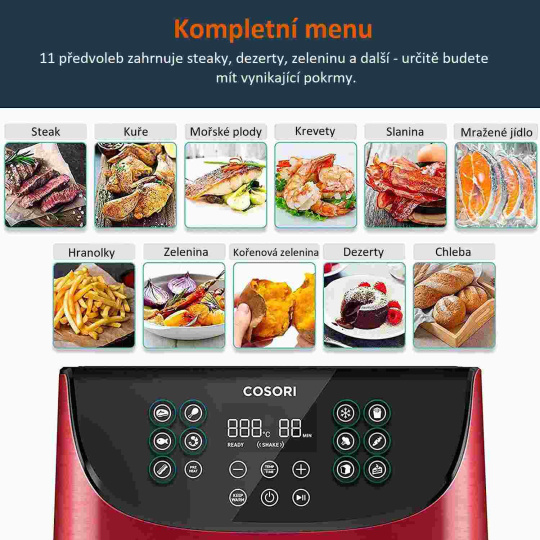 S horkovzdušnou fritézou COSORI CP158-AF PREMIUM si můžete užít vaše oblíbená smažená jídla bez výčitek, protože na rozdíl od běžného smažení nebo fritování je možné v ní připravovat jídla za použití velice malého množství oleje a nebo vůbec žádného. Kombinace cirkulujícího horkého vzduchu, dokonalé teploty vaření a chytrých programů zajistí, že hranolky budou vždy krásně křupavé a kuřecí stehna šťavnatá. Ať už je vaše jídlo čerstvé nebo mražené, stisknutím tlačítka můžete horkým vzduchem smažit kuřecí křídla, kuřecí prsa, sladké brambory, steaky, čerstvé hranolky a mnoho dalšího. Až budete mít hotovo, čištění bude stejně snadné díky nepřilnavému koši, který lze mýt v myčce. Díky veliké nádobě s objemem 5,5l navíc dokážete rychle navařit i pro větší rodinu nebo skupinu hostů.