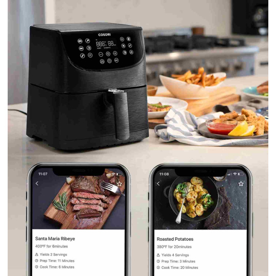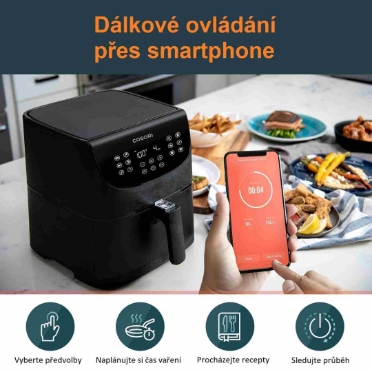 S horkovzdušnou fritézou COSORI CS158-AF PREMIUM SMART si můžete užít vaše oblíbená smažená jídla bez výčitek, protože na rozdíl od běžného smažení nebo fritování je v této horkovzdušné fritéze možné připravovat jídla za použití velice malého množství oleje nebo vůbec žádného. Kombinace cirkulujícího horkého vzduchu, dokonalé teploty vaření a chytrých programů zajistí, že hranolky budou vždy krásně křupavé a kuřecí stehna šťavnatá. Programy si rychle a pohodlně můžete nastavit také přes Smartphone nebo Amazon Alexa a Google Assistant. Až budete mít hotovo, čištění bude stejně snadné díky nepřilnavému koši, který lze mýt v myčce. Díky veliké nádobě s objemem 5,5l navíc dokážete rychle navařit i pro větší rodinu nebo skupinu hostů.
