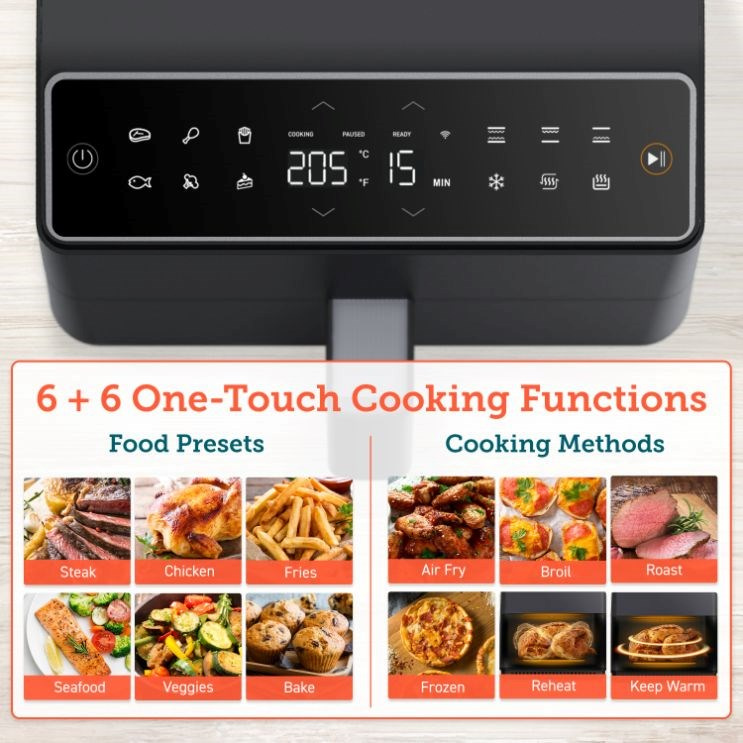 S horkovzdušnou fritézou COSORI CAF-P583S SMART si můžete užít vaše oblíbená smažená jídla bez výčitek, protože na rozdíl od běžného smažení nebo fritování je v této horkovzdušné fritéze možné připravovat jídla za použití velice malého množství oleje nebo vůbec žádného. Patentovaná technologie THERMO IQ 360° HEAT CIRCULATION přesně reguluje teplotu inteligentním teplotním algoritmem a zajišťuje tak rovnoměrně uvařené jídlo bez nutnosti jeho protřepání nebo překlápění. Kombinace cirkulujícího horkého vzduchu, dokonalé teploty vaření a chytrých programů zajistí, že hranolky budou vždy krásně křupavé a kuřecí stehna šťavnatá. Programy si můžete rychle a pohodlně nastavit také přes smartphone nebo Amazon Alexa a Google Assistant. Až budete mít hotovo, čištění bude stejně snadné díky nepřilnavému koši, který lze mýt v myčce. Díky veliké nádobě s objemem 6,4l navíc dokážete rychle navařit i pro větší rodinu nebo skupinu hostů.