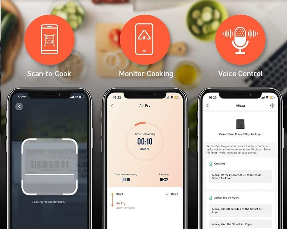 S horkovzdušnou fritézou COSORI CAF-P583S SMART si můžete užít vaše oblíbená smažená jídla bez výčitek, protože na rozdíl od běžného smažení nebo fritování je v této horkovzdušné fritéze možné připravovat jídla za použití velice malého množství oleje nebo vůbec žádného. Patentovaná technologie THERMO IQ 360° HEAT CIRCULATION přesně reguluje teplotu inteligentním teplotním algoritmem a zajišťuje tak rovnoměrně uvařené jídlo bez nutnosti jeho protřepání nebo překlápění. Kombinace cirkulujícího horkého vzduchu, dokonalé teploty vaření a chytrých programů zajistí, že hranolky budou vždy krásně křupavé a kuřecí stehna šťavnatá. Programy si můžete rychle a pohodlně nastavit také přes smartphone nebo Amazon Alexa a Google Assistant. Až budete mít hotovo, čištění bude stejně snadné díky nepřilnavému koši, který lze mýt v myčce. Díky veliké nádobě s objemem 6,4l navíc dokážete rychle navařit i pro větší rodinu nebo skupinu hostů.