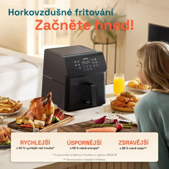Horkovzdušná fritéza je moderní nástroj pro moderní dobu. Bez problémů nahradí klasickou troubu při výrazně nižší spotřebě elektrické energie, nabídne zdravější přípravu oblíbených pokrmů s minimem oleje a v neposlední řadě také velmi tichý provoz pro nerušenou domácnost. Díky velké kapacitě fritovacího koše není problém uvařit pro čtyřčlennou rodinu nebo připravit perfektní pohoštění na večírek s přáteli.