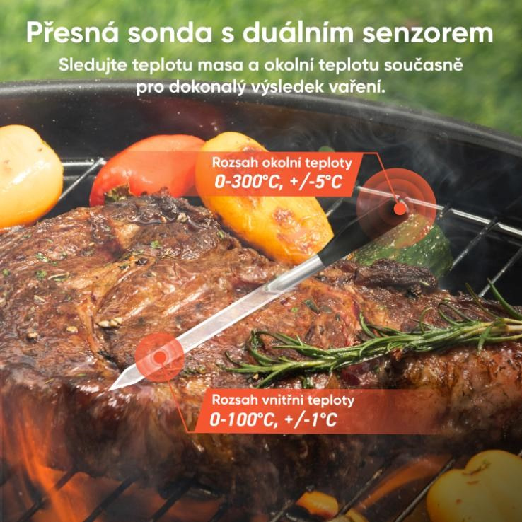 Naprostá kontrolu nad přípravou masa. Díky duálnímu senzoru nepřetržitě sleduje jak vnitřní teplotu masa, tak i teplotu okolního prostředí. To zajišťuje precizní výsledky a eliminuje veškeré dohady ohledně správné propečenosti. Aplikace vás včas upozorní, kdy maso otočit, a dokonce i kdy je ideální čas nechat ho odpočinout, aby bylo perfektně šťavnaté. Už žádné dohady, jen dokonalé výsledky pokaždé, když vaříte.