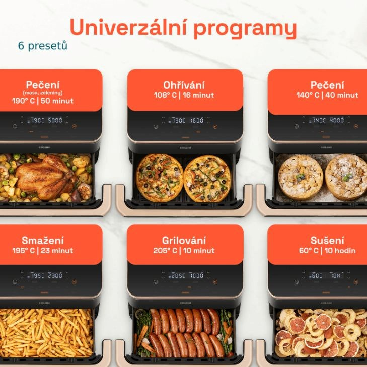 Cosori TwinFry zvládne díky šesti programům péct, fritovat, grilovat, péct sladké i slané a také třeba sušit. Je jedno jestli budete potřebovat celý 10l koš nebo vám stačí jen polovina. Fritéza rozdělením koše dokáže připravit dva nezávislé pokrmy, a to se hodí obzvlášť při přípravě jídla a přílohy najednou. Ovládací prvky jsou tak pohodlné a intuitivní, že se vaření stane záležitostí několika dotyků, a ne celodenního pobytu u kuchyňské linky.