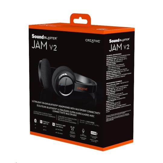 Vaše oblíbená přenosná Bluetooth® sluchátka na uši jsou zpět – se stejným designem lehkým jako pírko a vysoce kvalitními neodymovými měniči! Produkt Sound Blaster JAM V2 je nyní vybaven technologií Bluetooth 5.0. Společně s rozšířenými zvukovými kodeky aptX™ HD a aptX™ Low Latency poskytuje nejlepší bezdrátový poslech. Užijte si bohatý a dechberoucí zvuk. Funkce Multipoint umožňuje zřetelně přepínat mezi dvěma různými zdrojovými zařízeními Bluetooth, aniž byste vyšli z rytmu.