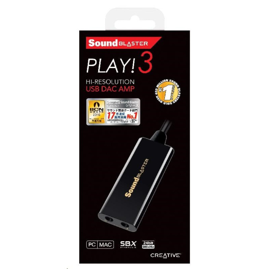 Zvuková karta Sound Blaster PLAY! 3 obsahuje USB DAC převodník a zesilovač a umožňuje rychle rozšířit zvukové vybavení základní desky. Je vhodná pro počítače PC i Mac. Ukrývá výkonný zesilovač pro celou řadu sluchátek: od jednoduchých mobilních sluchátek do uší po herní a studiová sluchátka. Software Sound Blaster PLAY! 3 Control Panel, který je k dispozici ke stažení, nabízí úžasně realistický zvuk a úchvatné zvukové efekty. Rovněž obsahuje optimalizované profily pro vybrané značky sluchátek.