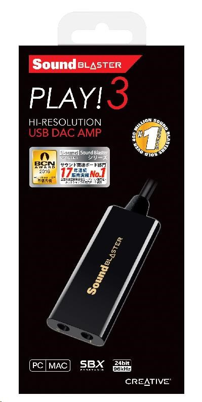 Zvuková karta Sound Blaster PLAY! 3 obsahuje USB DAC převodník a zesilovač a umožňuje rychle rozšířit zvukové vybavení základní desky. Je vhodná pro počítače PC i Mac. Ukrývá výkonný zesilovač pro celou řadu sluchátek: od jednoduchých mobilních sluchátek do uší po herní a studiová sluchátka. Software Sound Blaster PLAY! 3 Control Panel, který je k dispozici ke stažení, nabízí úžasně realistický zvuk a úchvatné zvukové efekty. Rovněž obsahuje optimalizované profily pro vybrané značky sluchátek.